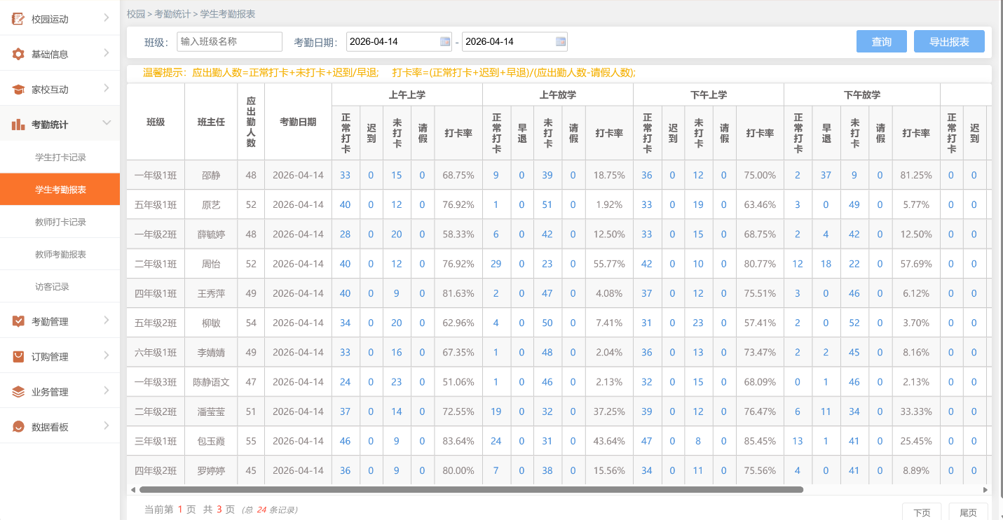 系統(tǒng)自動分析每日進出記錄,生成班級、年級、部門多維度考勤統(tǒng)計報表,清晰呈現(xiàn)應到人數(shù)、實到人數(shù)及缺勤明細