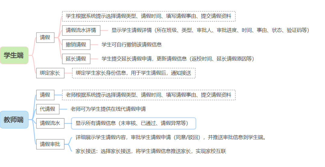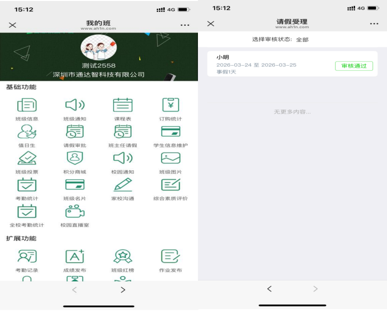 家長 / 學生通過微信公眾號提交請假申請,班主任在線實時審批,支持代請假、延長請假、撤銷請假功能